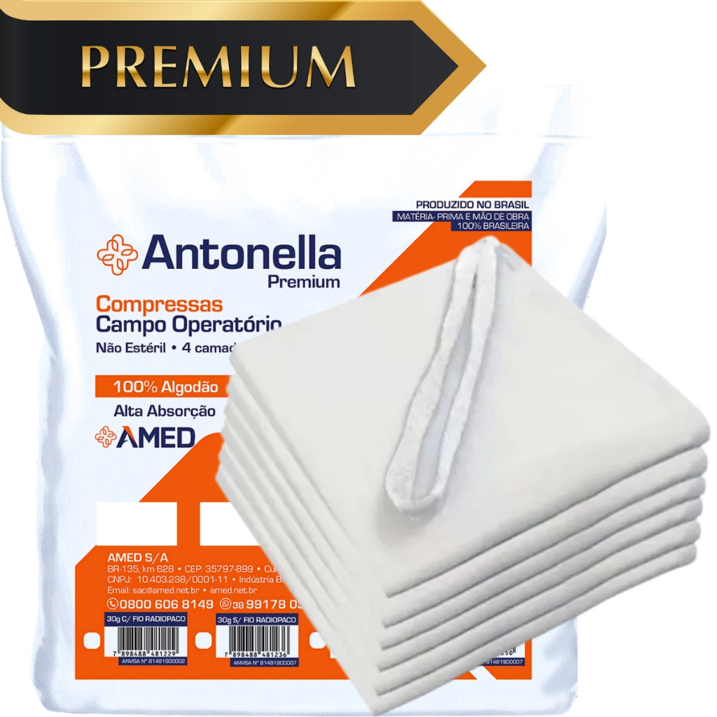 A Compressa Campo Operatório com Cadarço Antonella não estéril é confeccionada em tecido quádruplo sobreposto, 100% algodão e altamente absorvente. As camadas são compostas de ligamento em tela com quatro camadas de gaze fixadas entre si, de forma a evitar deslizamento das camadas possui dispositivo de fixação duplo em forma de alça.